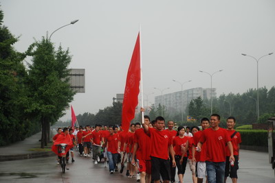 行军途中,队伍始终保持着整齐的队形和高昂的士气,时而起步前进、时而小跑行进。雨一直在下,队员们身上已分不清汗水与雨水。随着拉练距离的延伸,有的队员开始感到体力的困难。在风中猎猎飘扬的团队红旗,回荡在队伍的上空的嘹亮歌声,又不断地激励着团队的所有队员克服一切的困难,向前,向前……