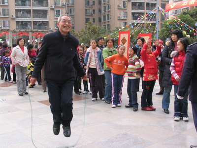 在整个活动现场,不少业主都是一家老少齐上阵。特别是双人绑腿跑与双人夹运气球活动,很多家长都是与孩子相互配合、共同完成的。不少大爷大妈也不示弱,跳绳、踢毽子都踊跃参与,广场上笑声、加油声不断,现场气氛活跃热烈,既开心、紧张,又秩序井然。