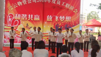 此次活动历时三个半小时,联谊会所有的节目都是由公司员工自编自演,小区业主积极踊跃报名参加。联谊活动以知识竞赛、文艺表演、团队拓展训练三个环节为主。在知识竞赛过程中,公司分为行政后勤、公共物业、住宅物业三支参赛队,知识竞赛以企业文化、物业知识、《弟子规》问答为主要内容,三支参赛队各具特色,各有所长,参赛队员信心百倍、胸有成竹,争先抢答,参赛队员标准流利的回答,赢得了现场的掌声和喝彩声,场面异常火爆,显示了员工对公司企业文化、物业管理知识和《弟子规》内容的充分掌握,同时也给员工创造了一个取长补短和交流学习的平台。随着活动的陆续展开,员工和业主开展了丰富多彩的文艺节目,以多姿多彩的歌舞、精彩的才艺展示、富有诗情画义的诗歌朗诵等节目获得了员工、业主的一致好评。为了增强团队协作精神,在最后的活动中开展了紧张激烈的拓展训练,员工、业主集中排队、统一编组、统一实施,增进了员工、业主之间的友谊,激发了大家团结友爱、勇于拼搏的信心和决心,增强了团队的凝聚力。展现了公司员工和业主团结向上的精神风貌,陶冶了情操,对瑞云物业公司有了更加深刻的认识。