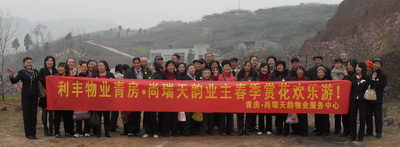 因青房·尚瑞天韵地处成都市西三环路沿线,附近娱乐、休闲场所有限,为了丰富广大业主的业余文化生活,搭建业主与业主,业主与物业公司之间相互交流、沟通的桥梁,体现利丰物业“关爱业主,感动业主”的服务精神和工作方向。我物业服务中心于2011330日组织了苑区业主在一年一度桃花盛开的季节到四川乃至全国闻名的桃花故里——龙泉宝狮湖的赏桃花游玩活动。在活动中,欢声笑语的场景无处不在,其乐融融的画面比比皆是,充分展现出邻里之间的温馨和谐,物业公司与业主之间的暖暖情谊。
