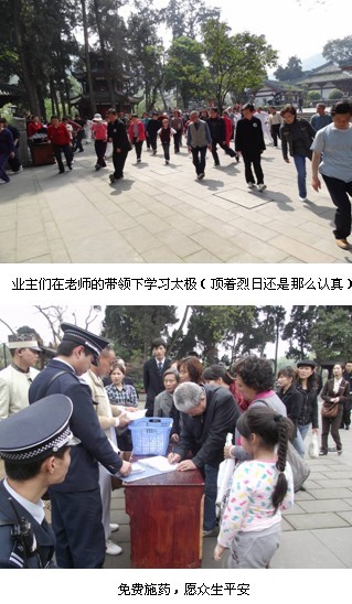 早上9点,大巴车分别从玲珑南域、双流锦镇出发,经过近两个小时的旅程,我们到达目的地——大邑县鹤鸣山道源圣城。11:00在祖天师殿进行的祈福仪式,掀起了整个活动的高潮,祈福过程中,业主们虔诚的跪在蒲团上,默默的为亲人、朋友的幸福安康祈祷;在接下来的午餐时间,物业服务工作人员和业主、业主和业主进行了愉快的沟通;午餐过后稍作休息,便由专业导游带领业主,介绍整个景区的的景点以及道教的文化;下午两点,导游介绍完毕后,在大殿的门口,一些老年业主在道源圣城太极拳大师的带领下,打起了太极;很多业主还兴致勃勃的去道源圣城的老君殿登山……