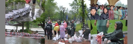 晚上十点洪水超过警戒水位,并越过我们设立的第一道防洪堤坝。因为我们的前期努力,洪水没有越过后面的2、3道堤坝。没有造成更大的损失。凌晨四点时,洪水逐渐消退,但奋战在第一线的员工门仍然没有一点松懈!