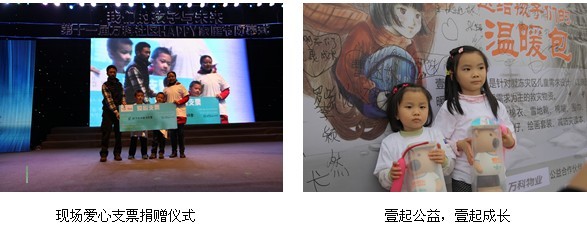 公益乐走是第十一届成都万科社区HAPPY家庭节系列活动的最后一站。本次活动以家庭为单位,参与家庭以积累的乐步里程数募集爱心公益基金,每乐走1公里,万科物业合作伙伴为壹基金捐赠100元。据统计,10月26日下午,来自成都万科13个社区共631户家庭、2000余人参加了本次公益乐走活动,乐走公里里程数为2094公里,总共募集爱心公益金209400元,全部专项用于壹基金温暖包行动。壹基金温暖包是针对凝冻灾区儿童需求设计,以满足儿童保暖、卫生及心理需求为主的救灾物资。2013年度温暖包含棉衣、雪地靴、棉帽、围巾、手套、棉袜、冻疮膏、袋鼠公仔、绘画套装、减防灾读本、书包、纸箱等12件物品。在晚上举行的HAPPY家庭闭幕式晚会上,由第一个完成乐走的城市花园家庭代表参与乐走的所有家庭与壹基金代表李弘总监进行了现场捐赠仪式。