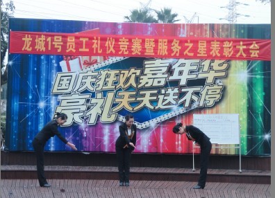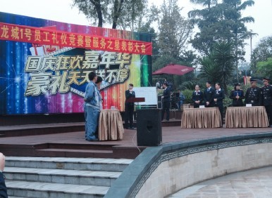 为进一步宣扬品质服务理念,普及礼仪知识,持续提升服务品质及物业服务水平,2013年10月29日15:00——17:00物业服务中心在小区聚龙广场举办了员工礼仪竞赛。
