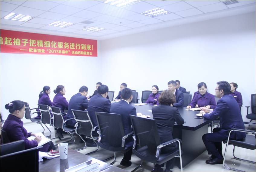 2017年3月6日,成都欧菲物业响应成都市物业管理协会号召,开启“撸起袖子把精细化服务进行到底!”——“2017幸福年”活动启动宣贯会。成都欧菲物业总经理陈曦主持会议,公司中高层管理人员及客户代表参加了本次会议。