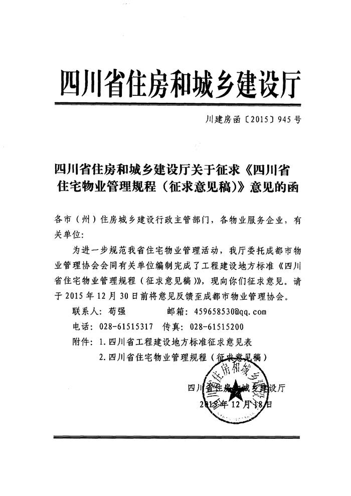 上一条:关于进一步做好岁末年初物业管理区域安全防范工作的通知 下一条:关于开展成都市培育发展社会组织专项资金扶持项目“成都市物业管理协会和谐物管大讲堂”行业免费轮训的通知