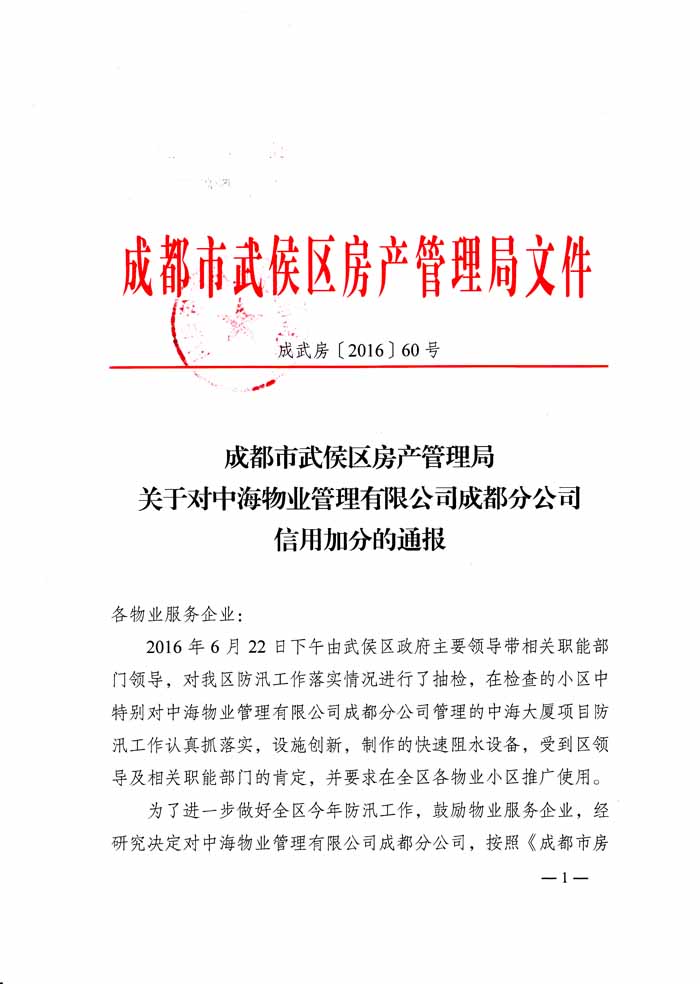 上一条:关于对四川力宝企业管理有限公司信用加分的通报 下一条:成都市武侯区房产管理局关于对成都市亿和物业管理有限公司批评的通报