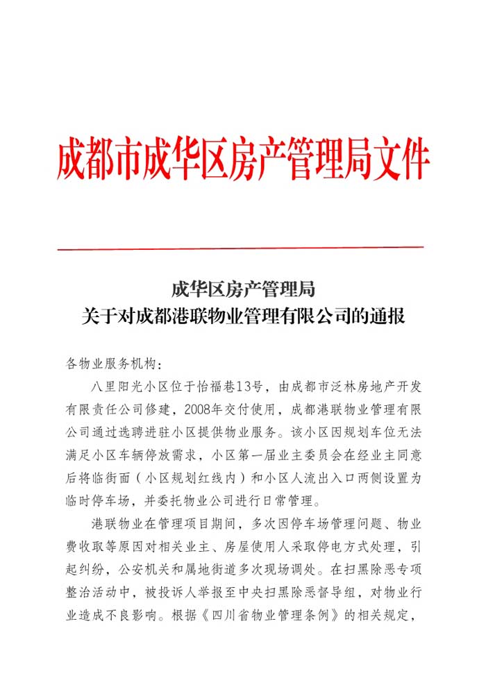 上一条:关于对成都中南物业服务有限公司的通报 下一条:成都市城乡房产管理局关于启动2018年度第二次物业管理大检查的通知