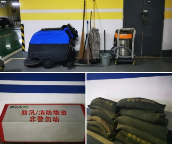 为了防止小区“水浸盘”,德商产投服务人下足了功夫。各项目全面排查小区所有的排水渠道并及时清理疏通,检查电子设施设备及各类机房,修筑临时隔水围栏,最大限度保障业主安全。