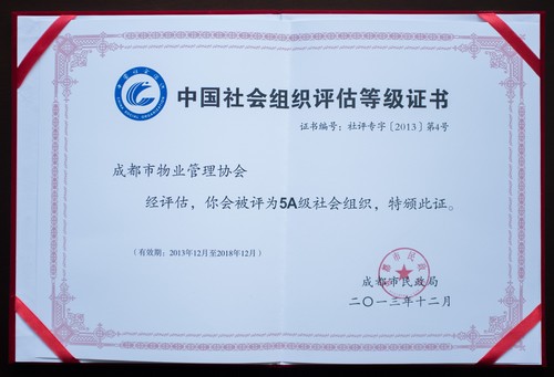 313,成都市民政局正式向成都市物业管理协会颁发中国社会组组评估等级证书和奖牌。成都市物业管理协会被评为中国社会组织评估最高等级—5A级社会组织,成为全省物业管理行业唯一获此殊荣的社会组织。